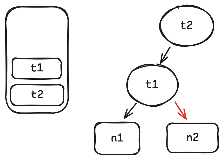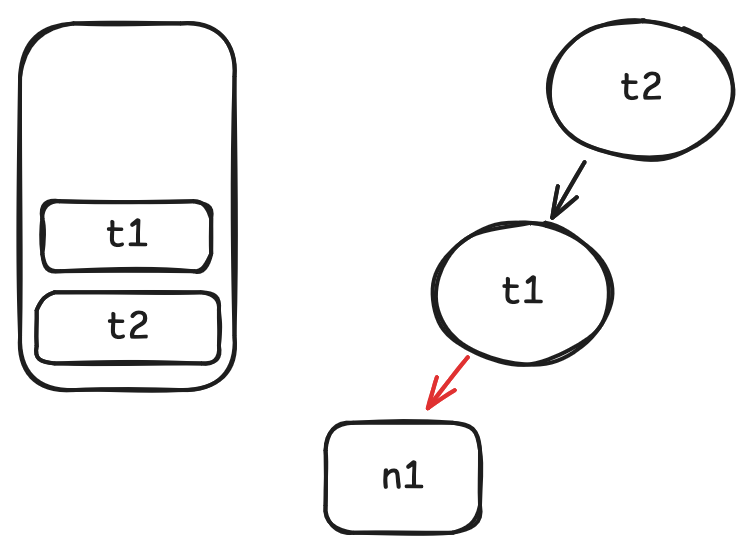 当用户调用 t2.get() 时, 我们在运行时会知道 t1.get() 和 n3.get() 在其中也被调用了. 因此 t1 和 n3 是 t2 的依赖, 并且我们可以构建一个这样的图: