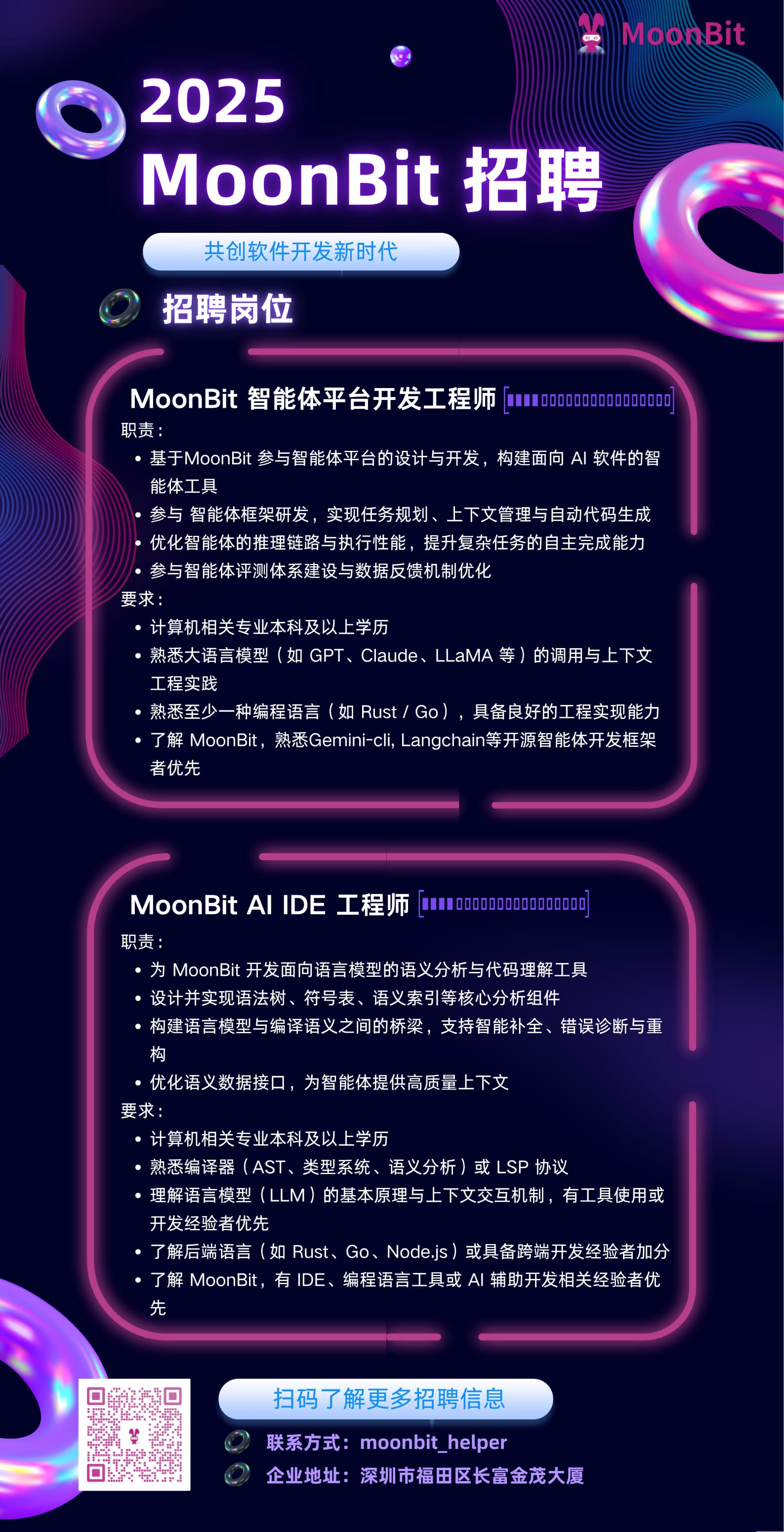 除智能体相关的研发岗位外,我们也欢迎对 编程语言设计、开发者工具 等方向感兴趣的人才加入,共同推动 MoonBit 语言与生态的发展。