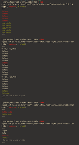 - 增强了 expect/snapshot test diff 的可读性。现在,这些地方使用 unified diff 格式展示期望和实际值的差异,使得在 CI、文件等不输出颜色的场景下依然可读,同时在可以展示颜色时可以看到着色、划重点的对比结果。